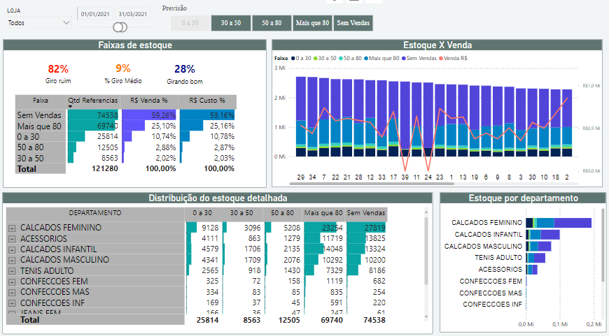 Visualizar análises detalhadas: dashboards que apresentam informações como giro de estoque por faixa de dias, desempenho por loja, vendas por departamento e mais.